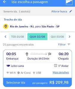 O fluxo de compra foi redesenhado. Agora será possível armazenar os dados de viagens frequentes, favoritar destinos para compras rotineiras e salvar cartões de débito ou crédito para compras futuras. O aplicativo também oferece informações mais detalhadas sobre o ônibus e a viagem, incluindo itinerários, horários de partida e chegada, locais previstos para paradas e informações sobre os serviços disponíveis a bordo, como wi-fi e USB individuais.