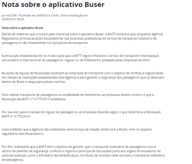 Além disso, a agência enfatiza que não estabelece nenhum tipo de relação direta com a Buser, nem no aspecto regulatório nem fiscalizatório.