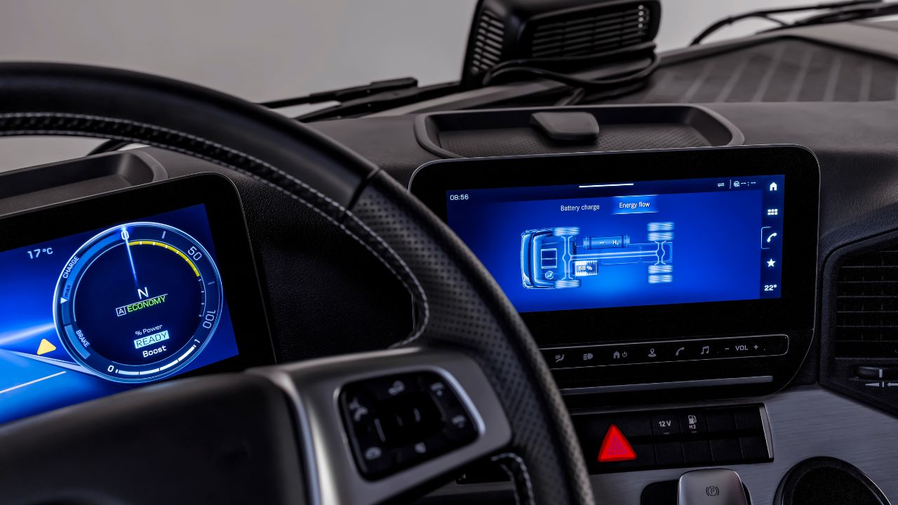 O salto tecnológico mais significativo do NextGenH2, no entanto, reside na sua profunda sinergia com a plataforma elétrica a bateria da marca. A Daimler Truck executou uma integração sistemática de componentes-chave de série do Mercedes-Benz eActros 600, elevando drasticamente o nível de maturidade técnica. A cabine ProCabin, otimizada aerodinamicamente, faz sua estreia em um caminhão a hidrogênio, reduzindo o coeficiente de arrasto (Cd) em 9% em comparação com a geração anterior. O habitáculo é governado pelo Multimedia Cockpit Interactive 2 e pela mais recente arquitetura E/E (Eletrônica e Elétrica) da marca.