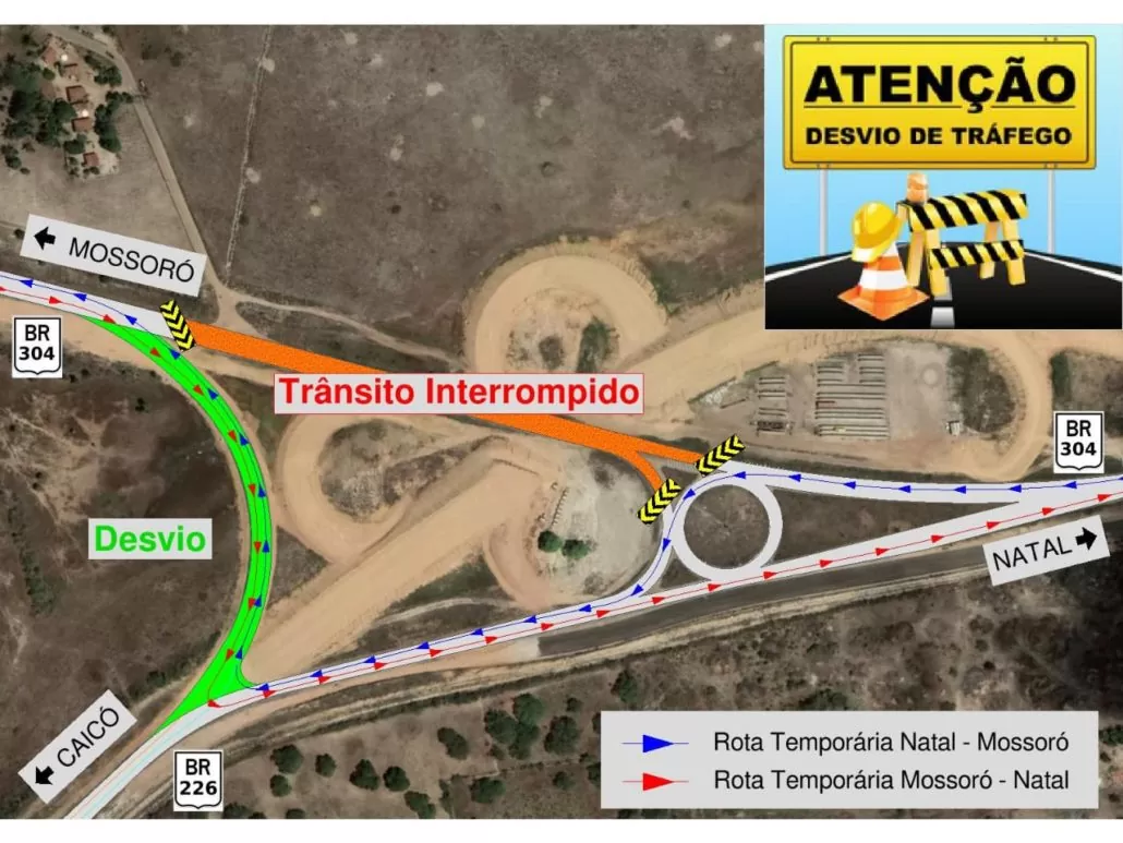 O tráfego na BR-304/RN, no Rio Grande do Norte, foi irrompido hoje (28) pela manhã devido a obras no local. O boletim divulgado pela DNIT (Departamento Nacional de Infraestrutura de Transportes), informa que haverá um desvio no tráfego, na altura do km 281, com duração aproximada de seis horas.
