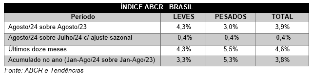 Na comparação com julho de 2023, o índice total registrou alta de 8,6%. O resultado foi determinado pela alta de 7,6% de leves e 13,7% de pesados, mantida a métrica de comparação anual.