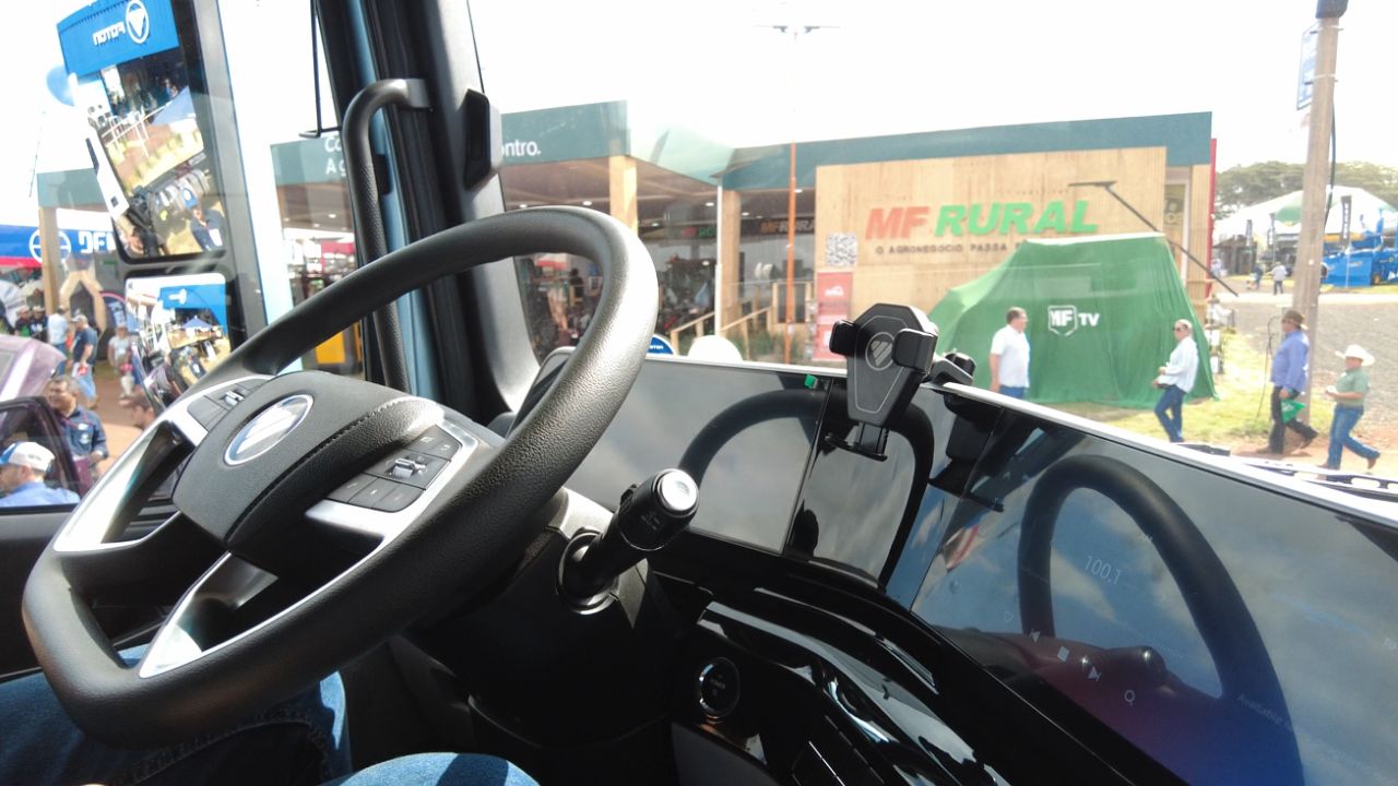 O posto de comando é dominado por duas telas grandes, sendo um painel de instrumentos totalmente digital e uma central multimídia. A versão exposta já contava com carregador por indução para smartphones e sistemas avançados de assistência ao condutor (ADAS), incluindo alerta de saída de faixa por meio de câmera. “É um ADAS muito eficiente para esse tipo de caminhão”, avalia Carrara.