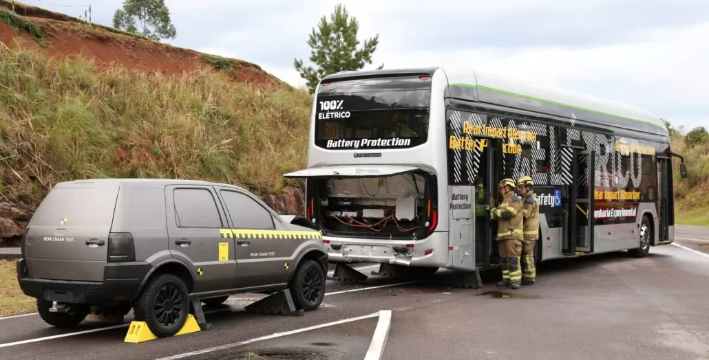 A Marcopolo realizou o primeiro crash test traseiro de ônibus elétrico do Brasil, que apresentou resultado positivo ao demonstrar uma estrutura com resistência a impactos acima do exigido pelas normas existentes, sem quaisquer danos às baterias.