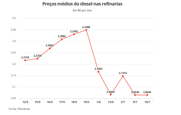 A Petrobras informou que vai manter nesta quarta-feira (10) os preços do diesel e da gasolina nas refinarias da estatal. Com isso, o litro do diesel continuará sendo comercializado, na média, a R$2,0649, enquanto o litro da gasolina permanecerá, também na média, a R$ 2,0649.