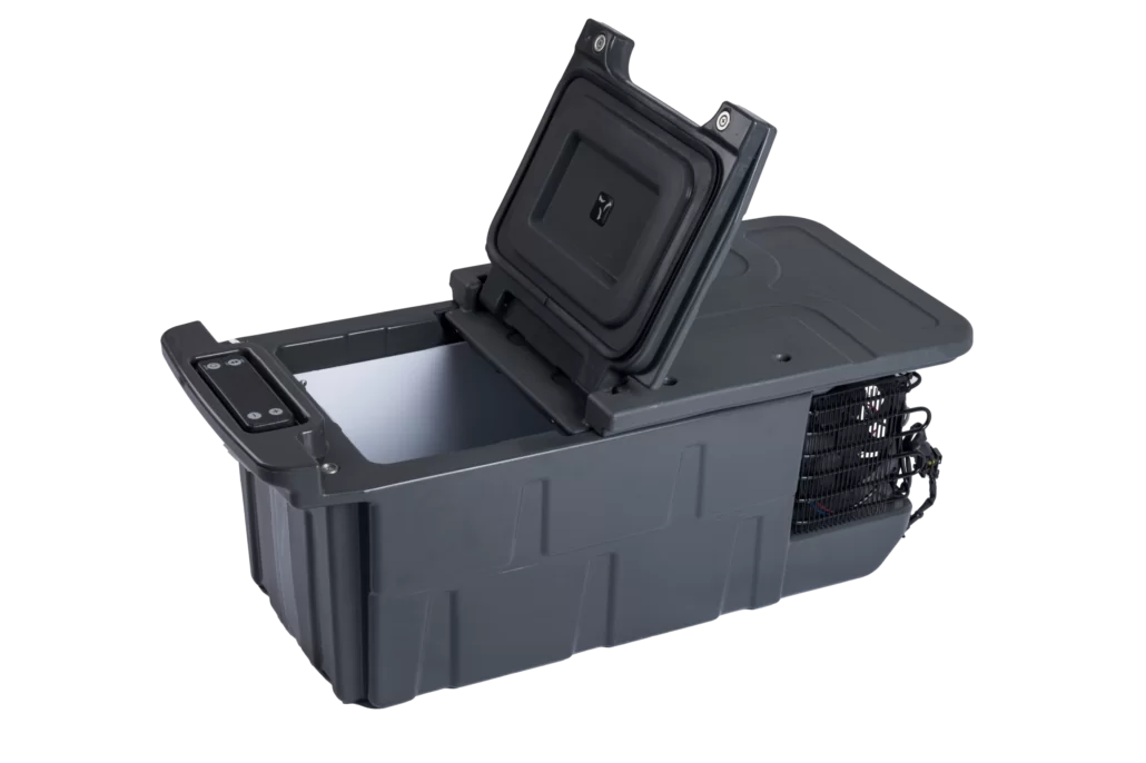 Funções: Controlador digital, 6 opções de ajuste de brilho, iluminação interna em LED, medição de temperatura interna, medição de tensão da bateria, proteção ajustável contra descarga da bateria do veículo (alta ou baixa), sensor de inclinação (desliga automaticamente o compressor caso a geladeira incline mais de 25º) e conectividade bluetooth.