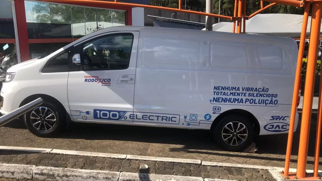 Trata-se de uma van E-JV5.5, da Jac Motors, que possui capacidade máxima de carga útil de 1.020 kg. O veículo apresenta peso bruto total (PBT) de 2.928 kg, autonomia de até 300 km e atinge até 150 km/h.