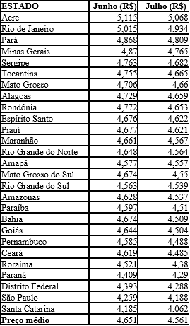 Entre as capitais, Florianópolis (R$ 3,896) e Curitiba (R$ 4,019) são as que apresentam preços menores. Entretanto, Rio de Janeiro (R$ 4,939) e Belém (R$ 4,851) têm os valores mais altos.