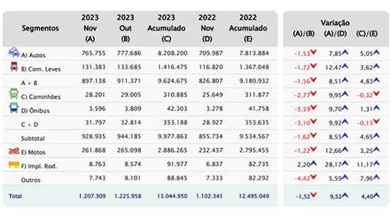 Já nos implementos rodoviários tiveram alta no mês (+2,2%) e um salto de 28,2% na comparação com novembro de 2022. No ano, o crescimento é de 11,2%. Enquanto o segmento de ônibus teve queda frente a outubro (-5,6%). Sobre novembro de 2022, a alta é de 9,7% e, no ano, o crescimento é de 1,3%.