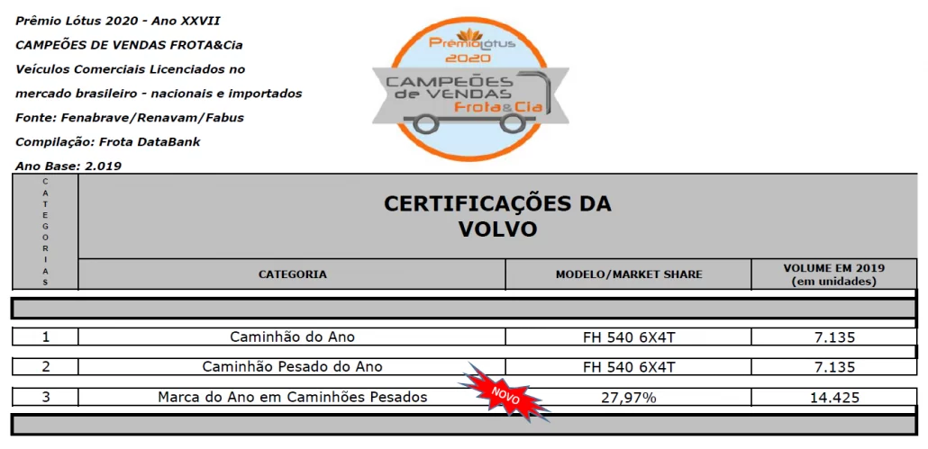 Outra importante conquista da marca, revelada pelo Prêmio Lótus 2020, foi a certificação do Volvo FH 540 6x4T como “Caminhão Pesado do Ano”, em reconhecimento às 7.135 unidades do modelo, licenciadas no Renavam no ano passado. É a terceira vez que o FH 540 6x4T recebe esse cobiçado troféu de campeão de vendas na categoria, concedido pela premiação.