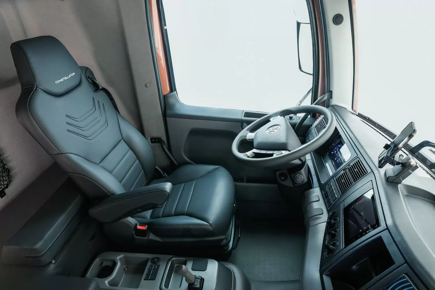 Agora, os modelos Constellation de 18 toneladas contam com um novo sistema de direção, mais preciso, suave e silencioso; e suspensão dianteira parabólica com mais durabilidade, robustez e maior capacidade de carga técnica. A suspensão de cabine com quatro pontos de amortecimento passa a ser um opcional para todos os modelos acima de 18 toneladas.